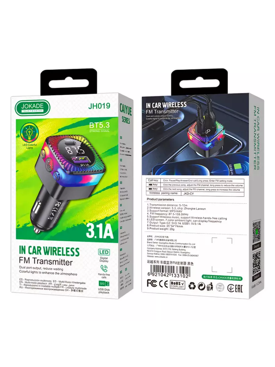 FM-трансмиттер Jokade JH019 — это универсальное решение для прослушивания музыки в любом автомобиле, даже в машинах со старой магнитолой. Он превращает ваш смартфон, флешку или карту памяти в полноценный музыкальный центр. Стильная RGB-подсветка создаёт нужную атмосферу, а поддержка быстрой зарядки QC3.0 и мощный выход 40W (3А) быстро зарядит ваши устройства в пути.